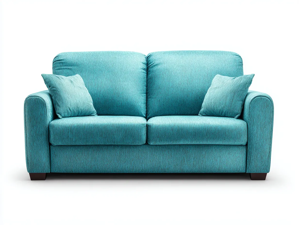 Rivestimento in tessuto di colore turchese abbinato a una struttura portante stabile con base di supporto in legno. La lavorazione garantisce una buona resistenza e comfort nel tempo.